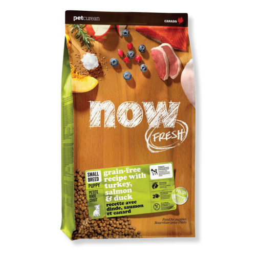 NOW FRESH™ Small Breed Puppy Recipe is made with 100% FRESH turkey, salmon, duck, and 100% fresh Omega 3 and 6 oils from coconuts and canola. NOW FRESH™ also features zero grains, gluten, wheat, beef, corn or soy. Zero rendered meats, by-products or artificial preservatives.