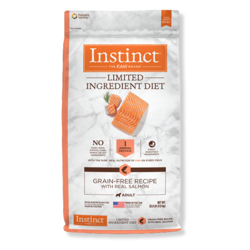 Introducing Instinct Limited Ingredient Diet Salmon Dog Food – the ideal choice for dogs with sensitive stomachs or sensitive skin. This carefully crafted formula is designed to eliminate common allergens, providing gentle, balanced nutrition that your dog can easily digest. Made with just one animal protein source—premium grass-fed salmon - and one vegetable, Instinct LID ensures simple, nutritious ingredients without any fillers.