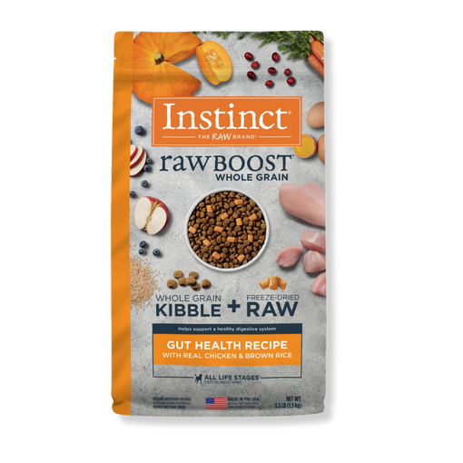 Instinct Raw Boost Whole Grain Gut Health Chicken and Brown Rice is a dry dog food formula designed for pet parents who want a kibble-based meal that includes added freeze-dried raw pieces for variety and texture. Made for adult dogs, this recipe combines traditional whole-grain kibble with raw-coated elements to support everyday feeding routines.