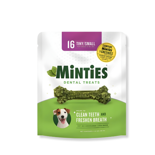 Minties Dental treats provide vet recommended dental care for your dog. Each delicious bone has a triple action formula to help clean teeth, promote fresh breath and help reduce plaque and tartar. Minties are made in the USA with no wheat, gluten, soy, corn, artificial flavors and animal by-products. The unique hardness, shape and texture keep your dog's teeth clean and healthy as he chews. Each treat contains five natural ingredients - peppermint, parsley, dill, fennel and alfalfa, that work in your dog's mouth and stomach to promote fresh breath and reduce unpleasant odors.