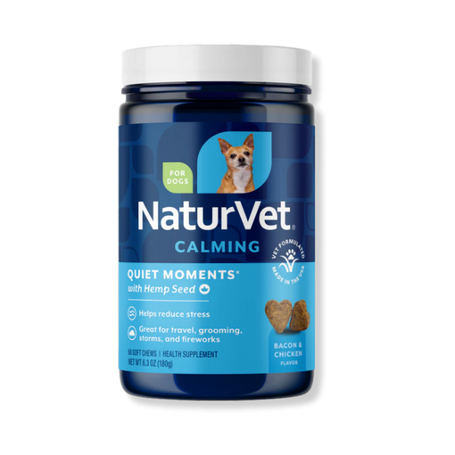 With the new Hemp Quiet Moments Calming Aid, you can help promote a calm and relaxed pooch because a calm dog is a happy dog! Our unique blend of hemp seed oil, hemp seed powder, L-tryptophan and Melatonin helps to reduce stress and tension. The added ginger supports sensitive stomachs which is especially important when traveling. Safe for use for all dogs over the age of 12 weeks.