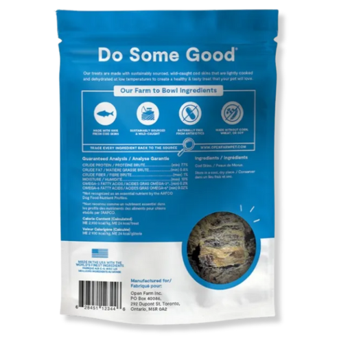 Ingredients You Can Trust: Just one simple ingredient: wild-caught cod skins. No artificial flavours, preservatives, or colours. Open Farm is committed to full transparency, ethical sourcing, and traceability you can trust.