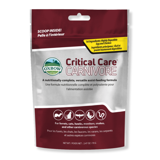Support recovery and maintain strength in meat-eating small pets with Oxbow Critical Care Carnivore. Formulated by veterinarians and used by leading exotic animal hospitals worldwide, this premium powdered formula provides essential nutritional support for ill, injured, or post-surgical carnivorous pets such as ferrets, hedgehogs, and meat-eating reptiles.