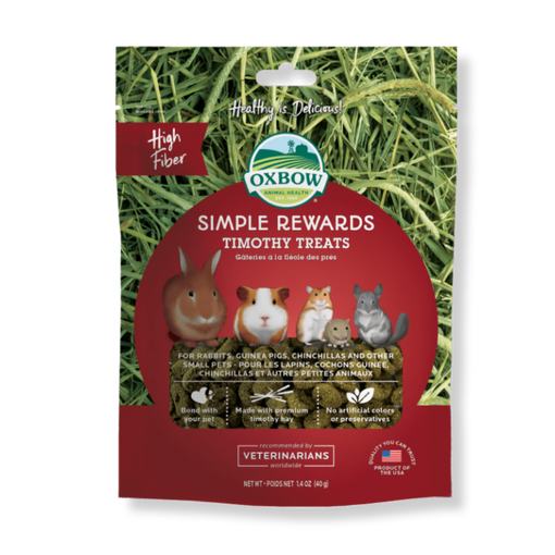 Oxbow Timothy Treats are a wholesome, healthy treat favorite of rabbits, guinea pigs, chinchillas and other small pets. Made with fiber-rich timothy grass hay, Timothy Treats offer the fresh Timothy flavor and aroma animals love. Use Timothy Treats to add variety and enrichment to your pet’s diet. Simple Rewards Timothy Treats allow you to give your animal a healthy, delicious treat you can both feel good about. Select a 3 Pack and Save 5% Select a 7 Pack and Save 10%